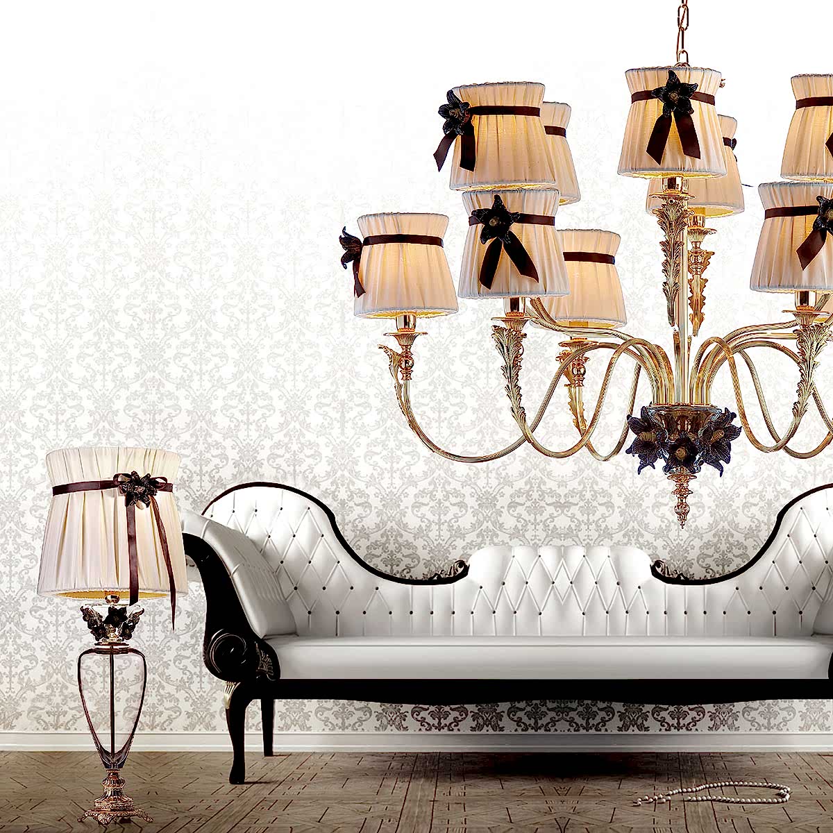 Il Pinco Marina не просто производит, а создает. Дизайн и инновации, исследования и разработки соответствуют методам работы величайших итальянских мастеров. Сплав из латуни, итальянский хрусталь, Муранское стекло, ткани из шелка и органзы, украшенные кристаллами Сваровски …